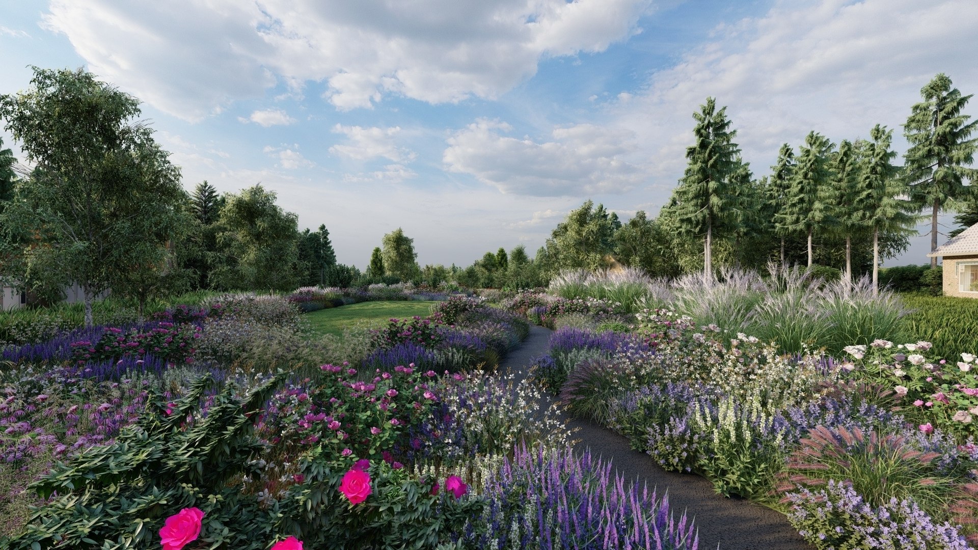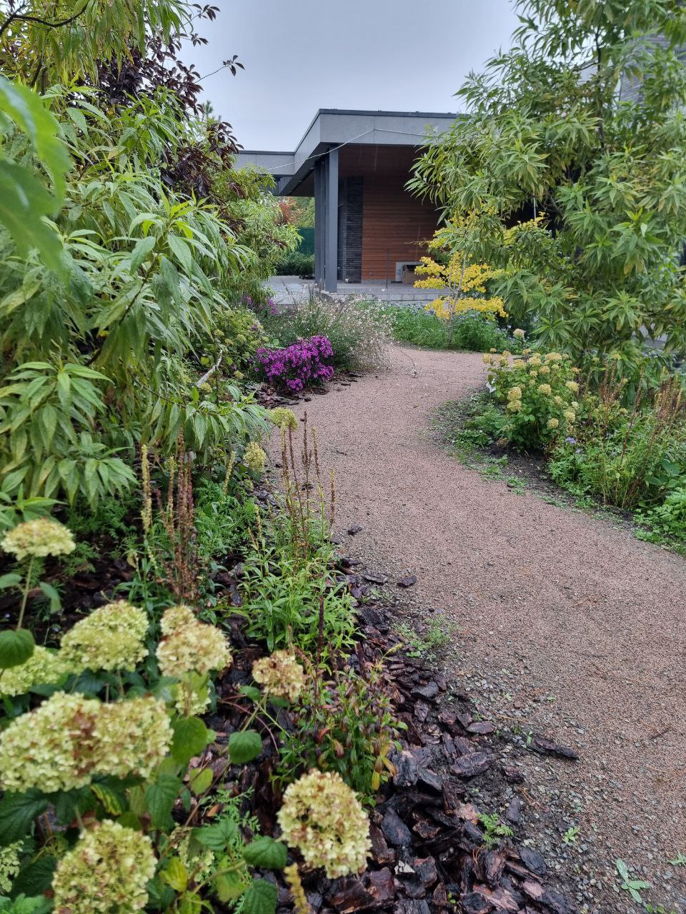 Рослини вийшли з периметру в центр, створивши об’єми і глибину. Газон вже не декоративне полотно, а мережа м’яких доріжок, що звиваються між масивами квітів та чагарників. Тепер сад захоплює, інтригує мякими вигинами, таємничими закуточками, тактильністю, грою вітру та чаруючими ефектами світлотіні.