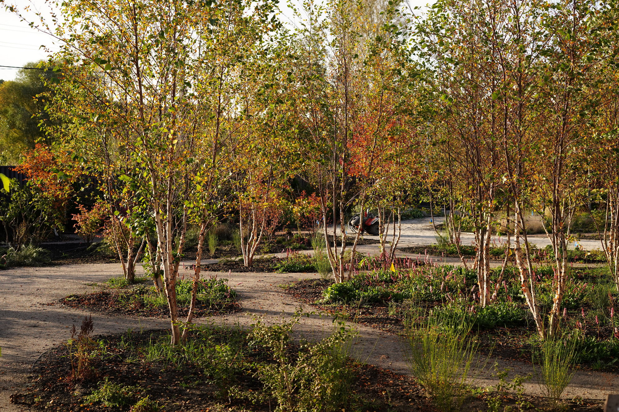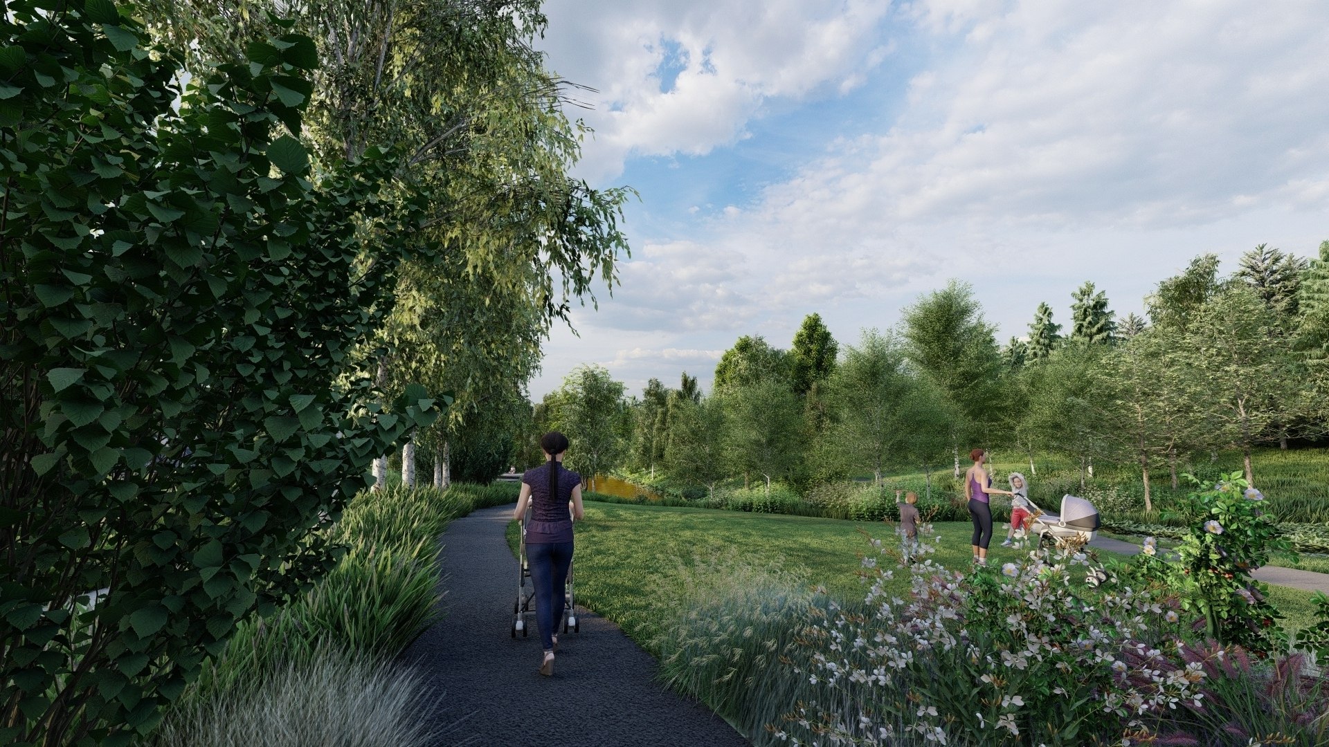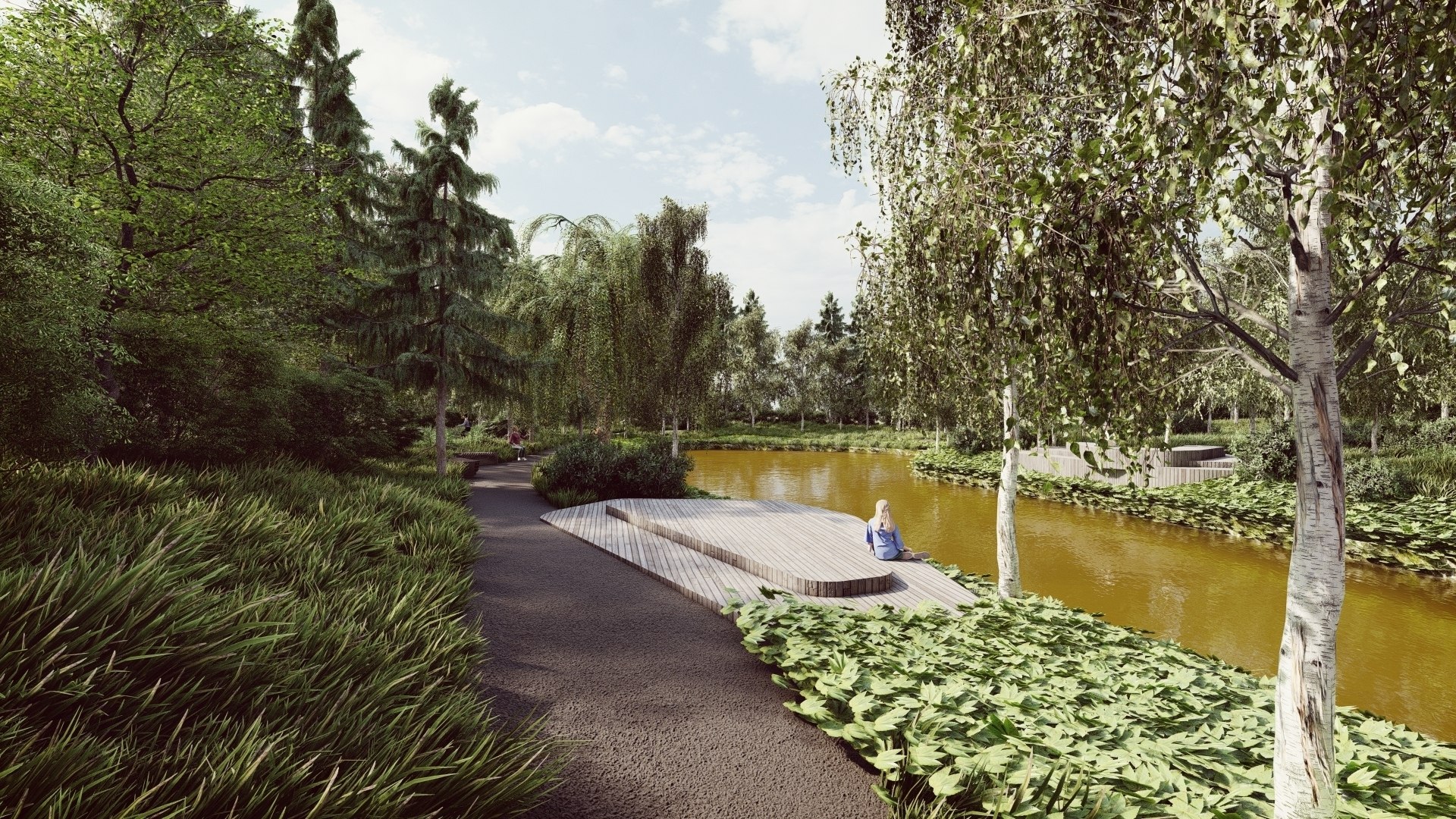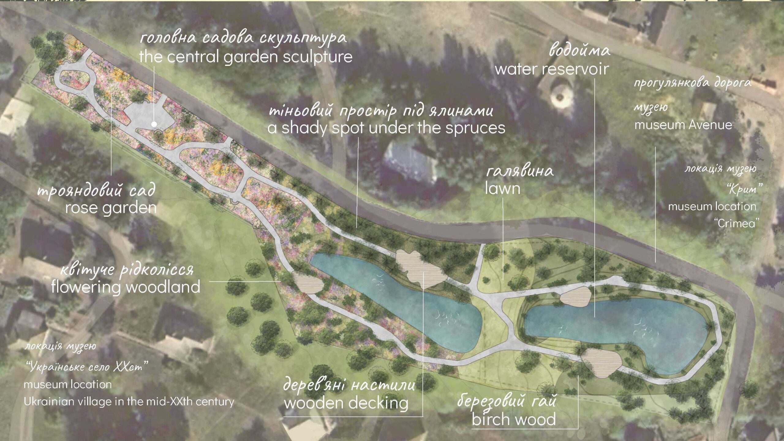 Це природній простір з різними по наповненню частинами: трояндовий сад, де королеви саду занурені в трави і квіти, квітуче рідколісся з різними чагарниками, велика галявина з газону і тіньова частина вздовж озер під величними ялинами та березами.