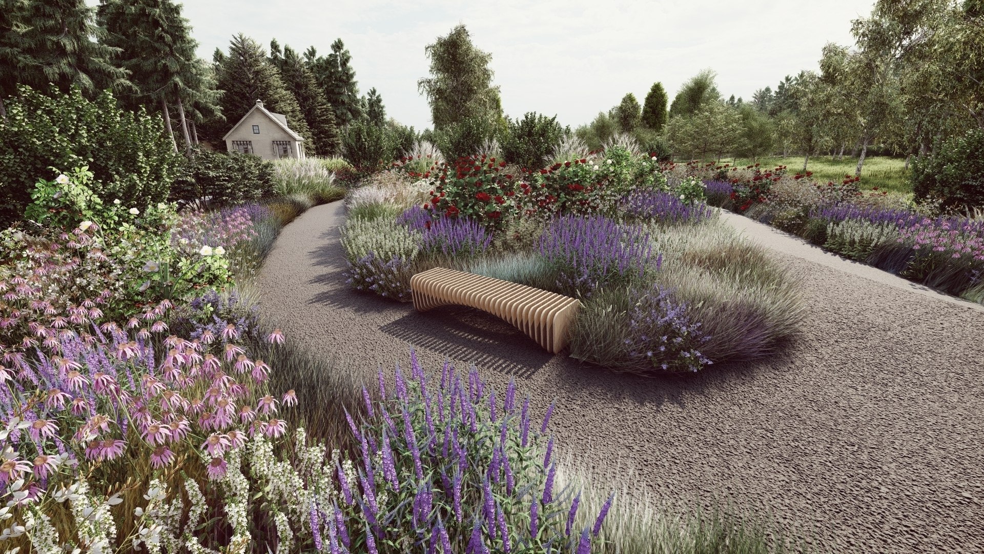 Ми побачимо величний заліснений відкіс, що здіймається над садом, ніби зелена стіна, і дає відчуття захищеності та камерності. Доріжки саду поведуть вглиб, від буйства гортензій, пишності злаків і розмаїття квітів до до тихих, спокійних тіньових закуточків.
