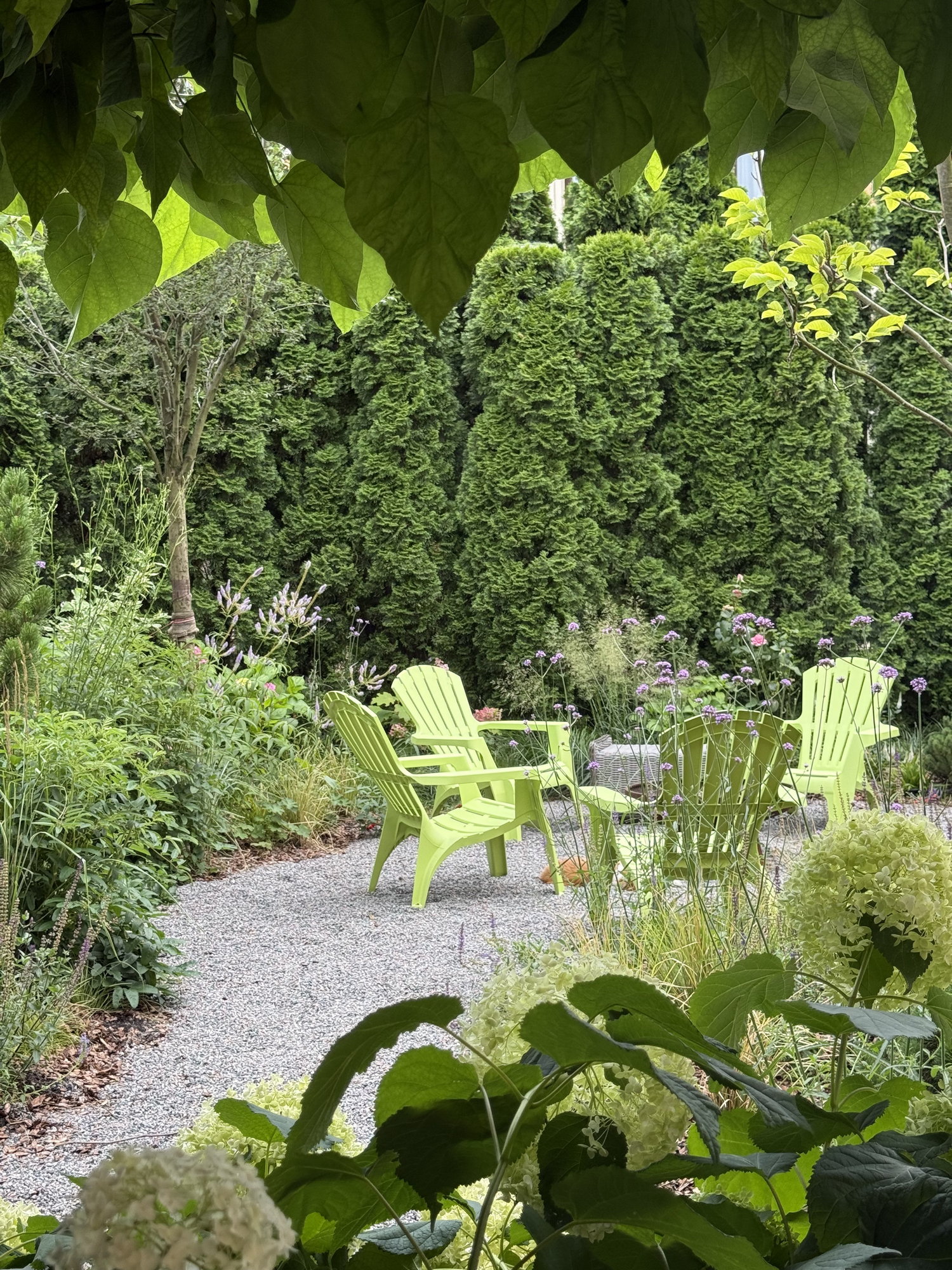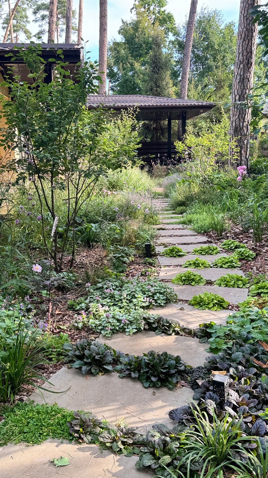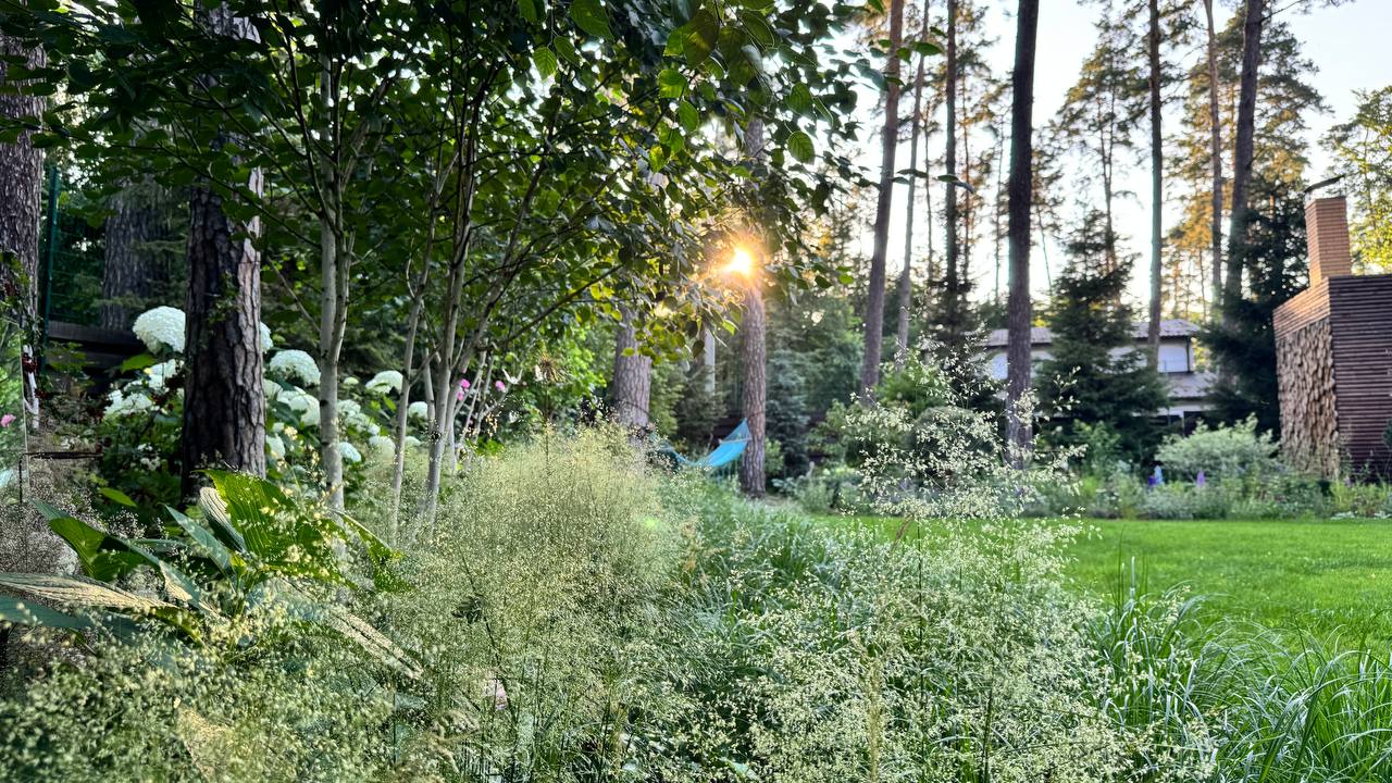 На місці колишнього мощення сьогодні росте гай з ірги, що створює легку тінь і змінює атмосферу ділянки протягом року. У тіні сосен розкривається світлий декоративний куточок із масивами гортензій та білокорими березами. А поєднання чітких доріжок і вільних посадок злаків та багаторічників створюють відчуття легкості, руху й повного перезавантаження.