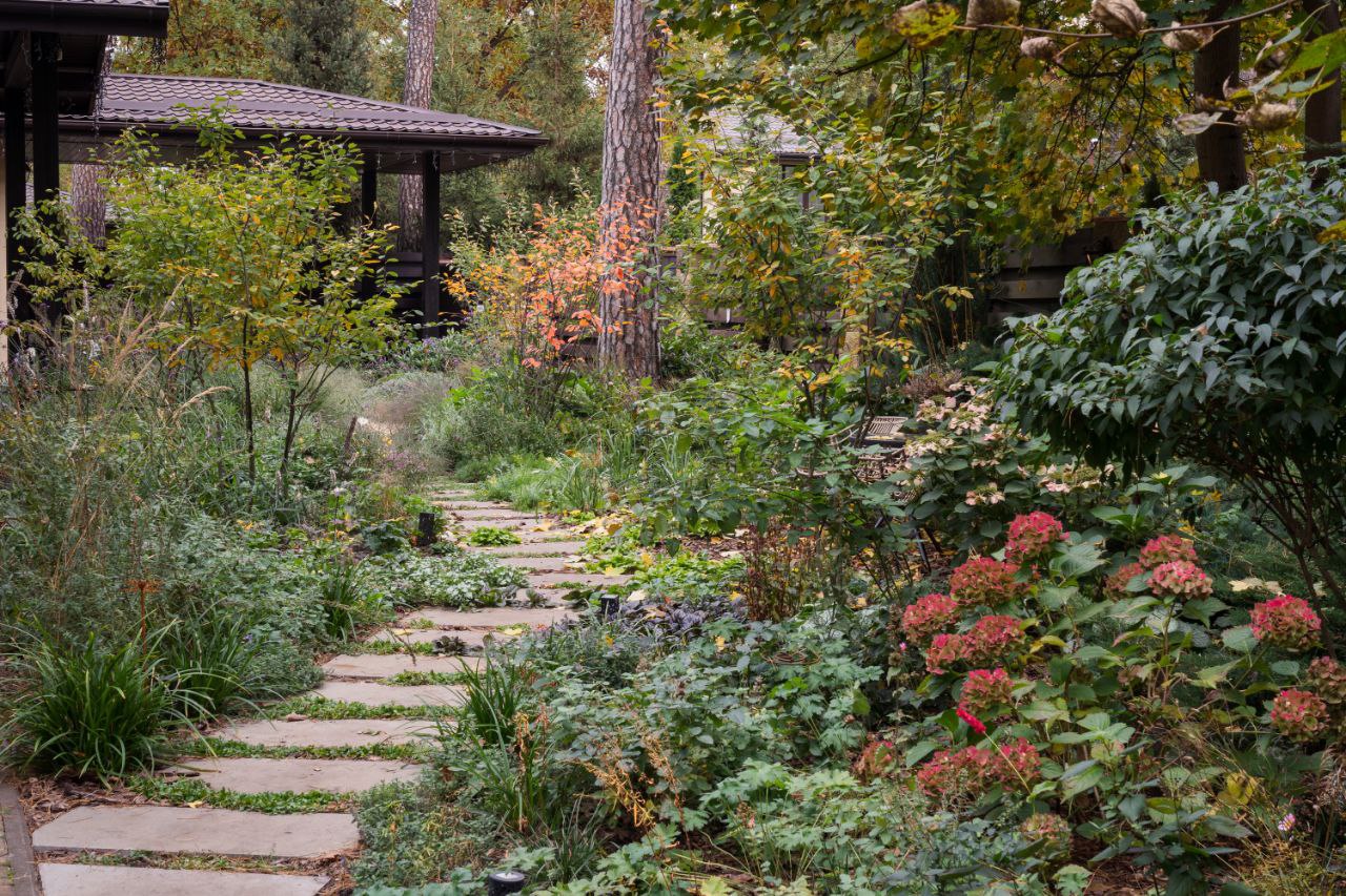 На місці колишнього мощення сьогодні росте гай з ірги, що створює легку тінь і змінює атмосферу ділянки протягом року. У тіні сосен розкривається світлий декоративний куточок із масивами гортензій та білокорими березами. А поєднання чітких доріжок і вільних посадок злаків та багаторічників створюють відчуття легкості, руху й повного перезавантаження.