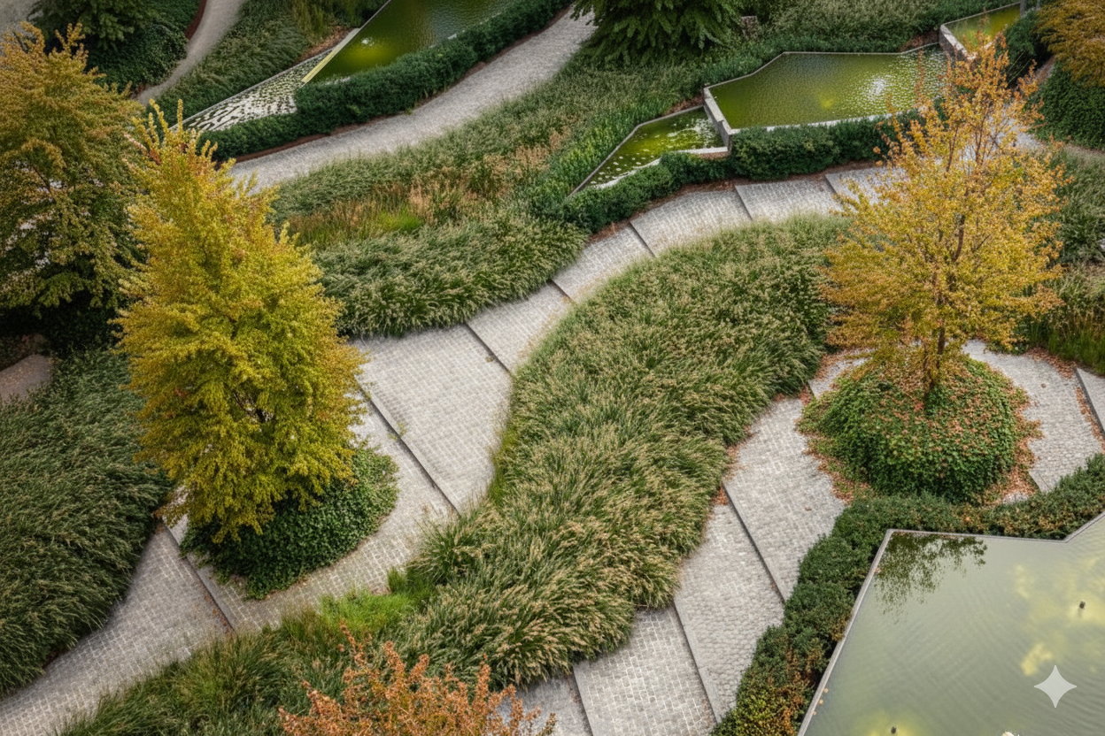 Чітка геометрія, скульптурні живоплоти й масиви з багаторічників і злаків, зібрані в дуже чисту, стриману композицію. У цьому саду головне — форма та масштаб: як Вірц будує простір зеленими об’ємами та працює зі світлом і тінню.