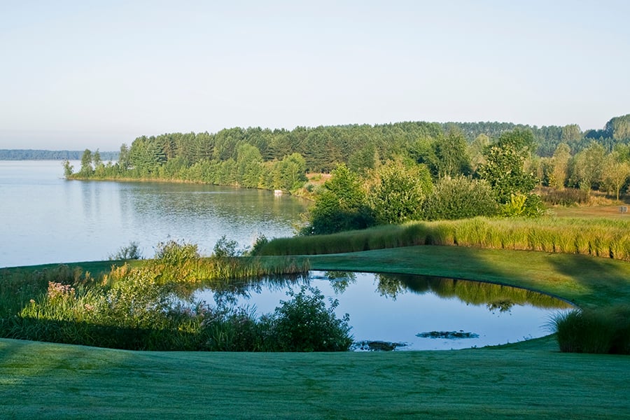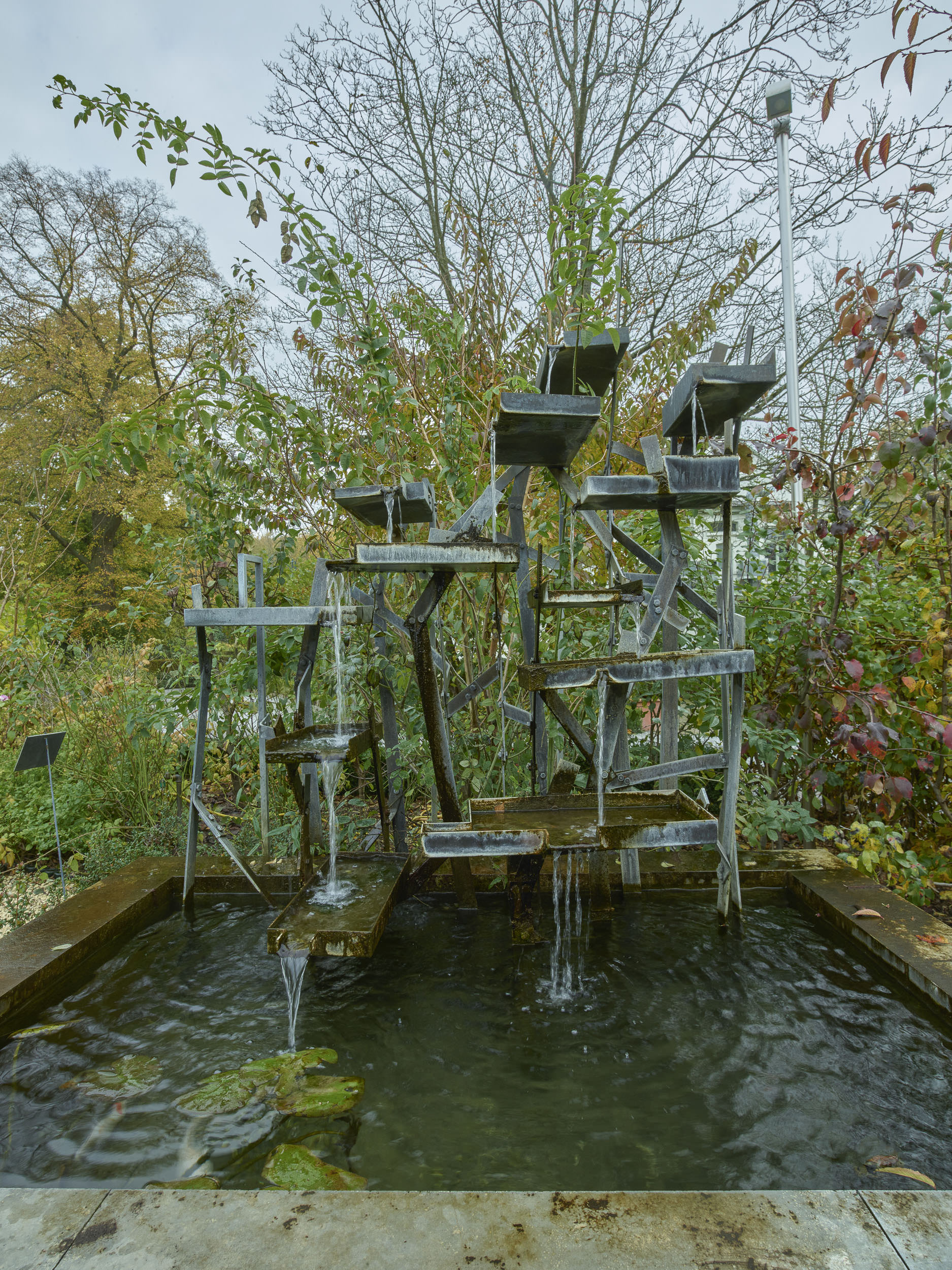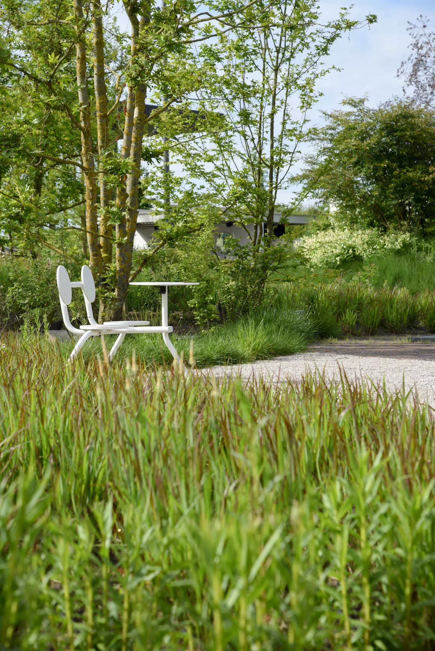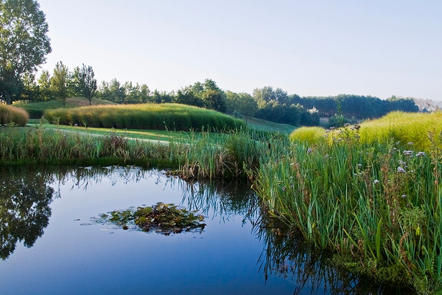 Ландшафт спроєктований за планами Жака Вірца: великі масиви злаків працюють як “живі хвилі” й дають дуже сильний сезонний ефект на тлі води та сучасного мистецтва.