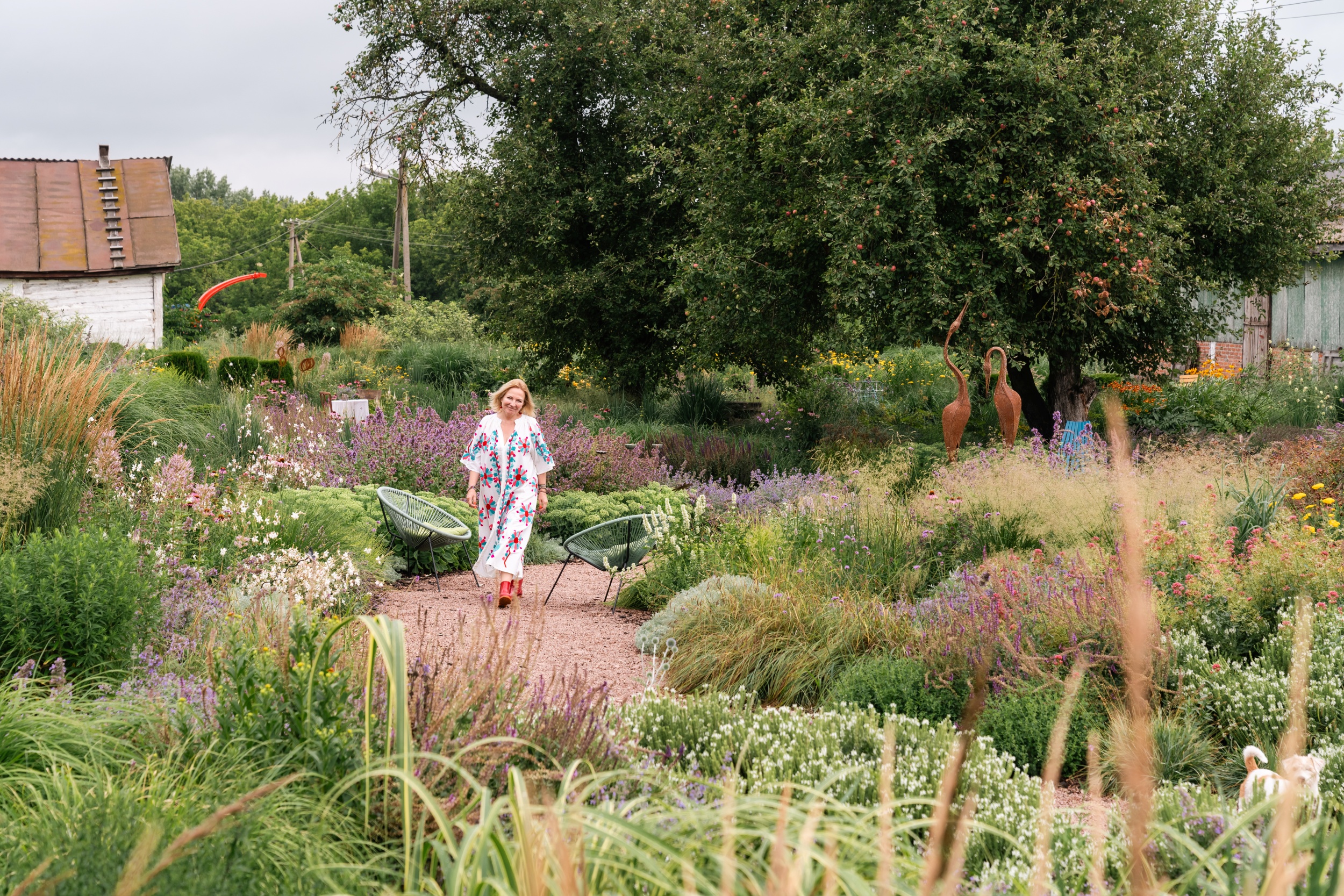 Ви дізнаєтесь, чому головну роль у композиції саду відіграють злаки, як обиралися рослини, здатні витримати сухі умови та як органічно створити квітник без штучної “правильності”. Власниця поділиться історіями про помилки й знахідки у підборі рослин.