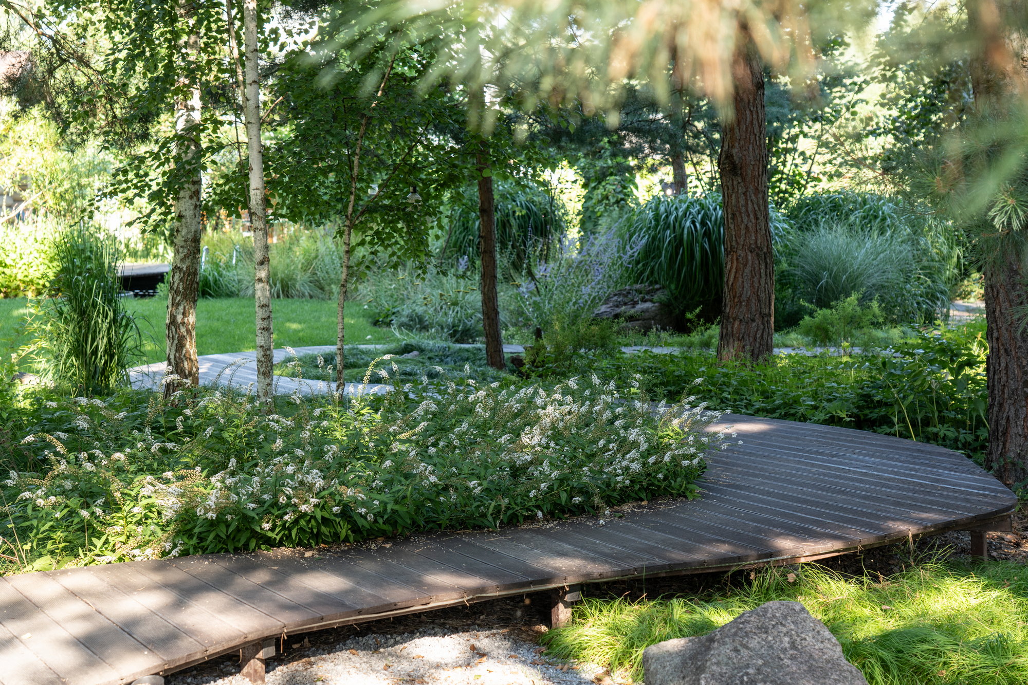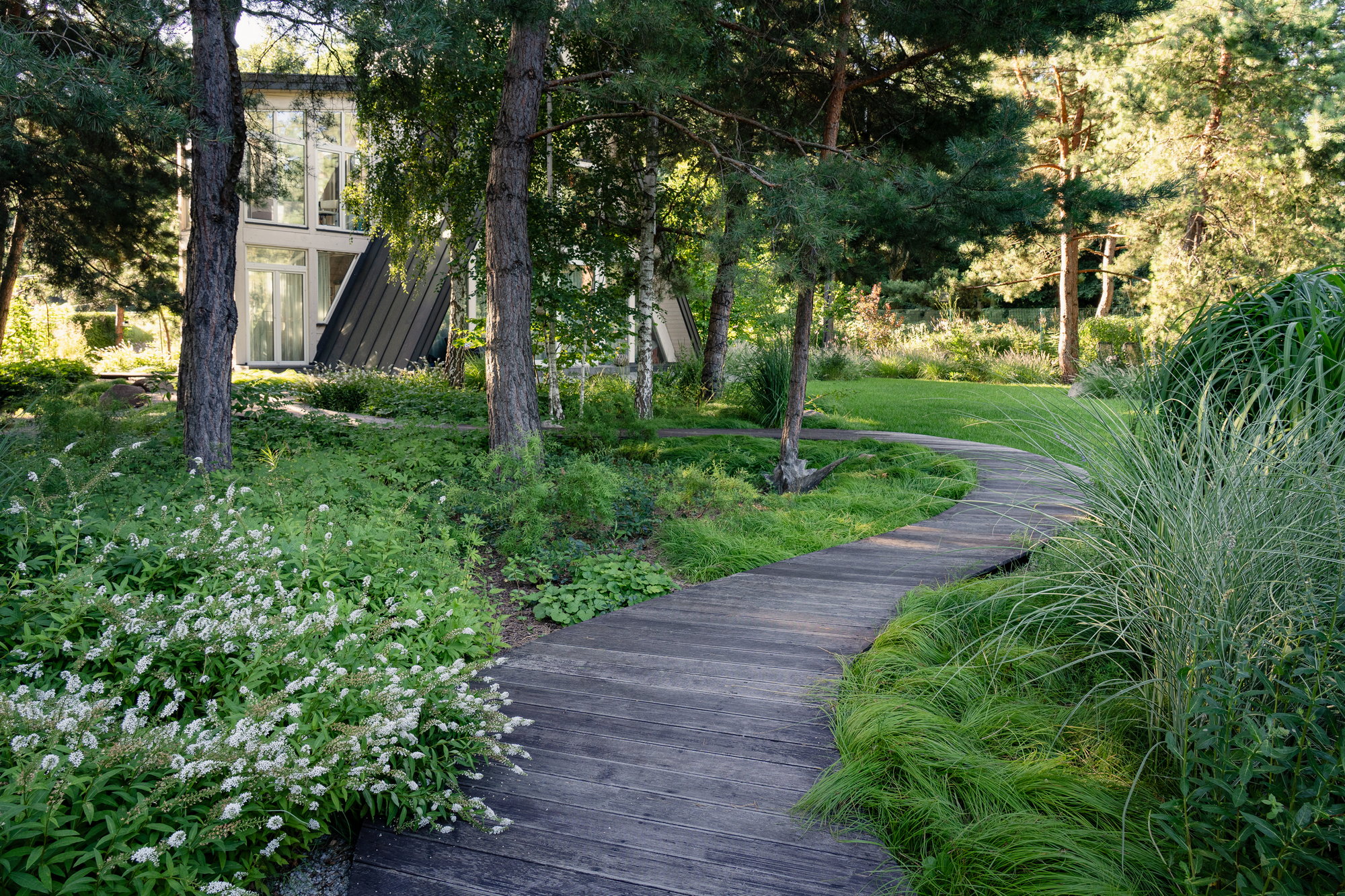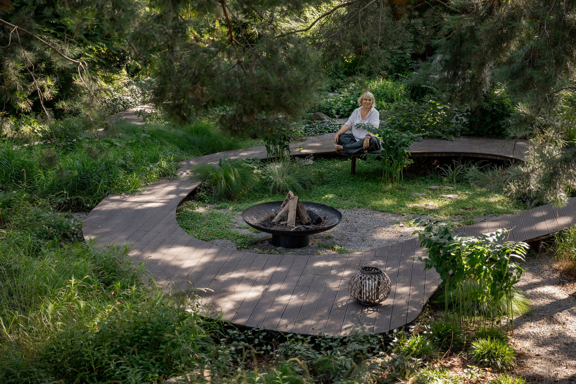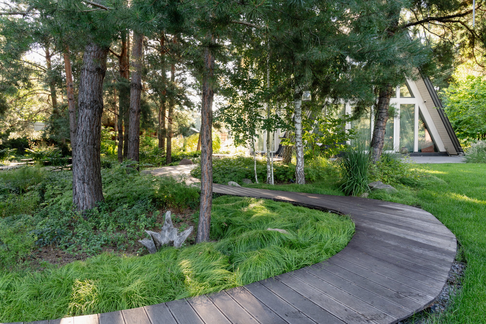 Простір площею 320 м², де панують високі природні сосни та атмосфера спокою. Головним елементом стала дерев’яна доріжка-магістраль, що веде до родинного вогнища.